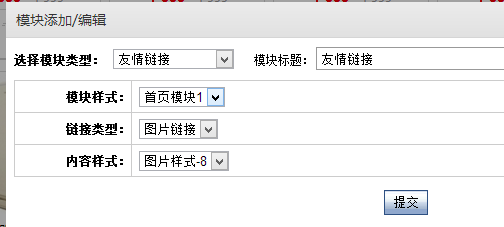 首頁(yè)要添加一個(gè)友情鏈接模塊,添加時(shí)選擇模塊類型為友情鏈接,填寫好模塊標(biāo)題,選擇好是文字鏈接或者是圖片鏈接(添加圖片鏈接時(shí)圖片要上傳到網(wǎng)絡(luò)硬盤中哦?。?,及模塊樣式、內(nèi)容樣式,如圖所示:
