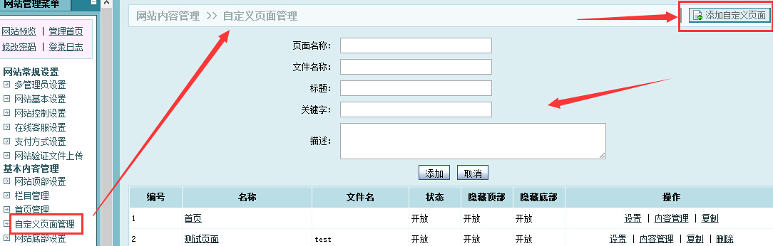 在網(wǎng)站后臺(tái)》網(wǎng)站基本內(nèi)容管理》自定義頁(yè)面管理,右上角添加自定義頁(yè)面,然后填寫好頁(yè)面名稱,描述等相關(guān)信息添加即可