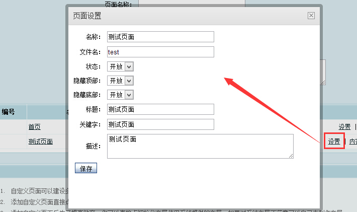 添加好新的自定義頁(yè)面后,點(diǎn)擊設(shè)置,可以編輯頁(yè)面的狀態(tài),標(biāo)題,關(guān)鍵字等內(nèi)容