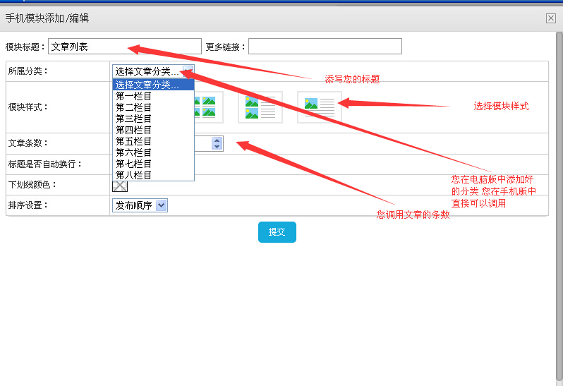首先,您進(jìn)入手機(jī)后臺管理中心,在左側(cè)中添加模塊 》選擇文章分類