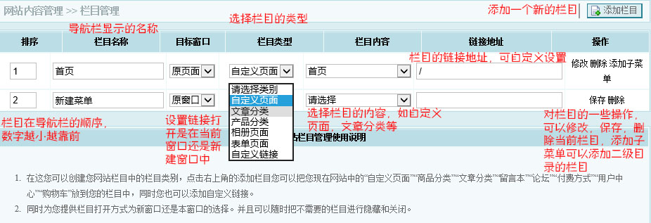 操作:對欄目的一些操作,可以修改,保存,刪除當(dāng)前欄目,添加子菜單可以添加二級欄目