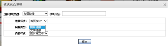 首頁(yè)要添加一個(gè)友情鏈接模塊,添加時(shí)選擇模塊類型為友情鏈接,填寫好模塊標(biāo)題,選擇好是文字鏈接或者是圖片鏈接(添加圖片鏈接時(shí)圖片要上傳到網(wǎng)絡(luò)硬盤中哦?。?,及模塊樣式、內(nèi)容樣式,如圖所示: