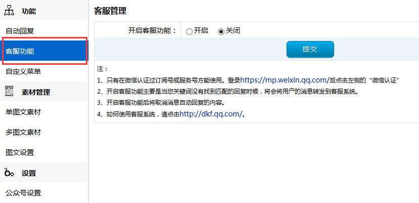 開啟客服功能主要是當(dāng)您關(guān)鍵詞沒有找到匹配的回復(fù)時(shí)候,將會(huì)將用戶的消息轉(zhuǎn)發(fā)到客服系統(tǒng)。